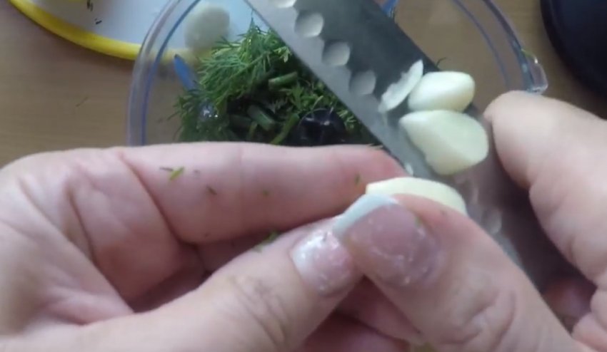Часник розбирають на шматочки, після чого кожну очищають від шкірки. Для полегшення роботи блендера кожну часникову часточку розрізають на дві-три частини і висипають в чашу.![]()