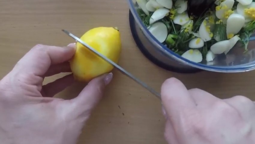 Лимон розрізають посередині, і, стискаючи в руці, витягують з фрукта сік, який також вливають у блендерную чашу.![]()