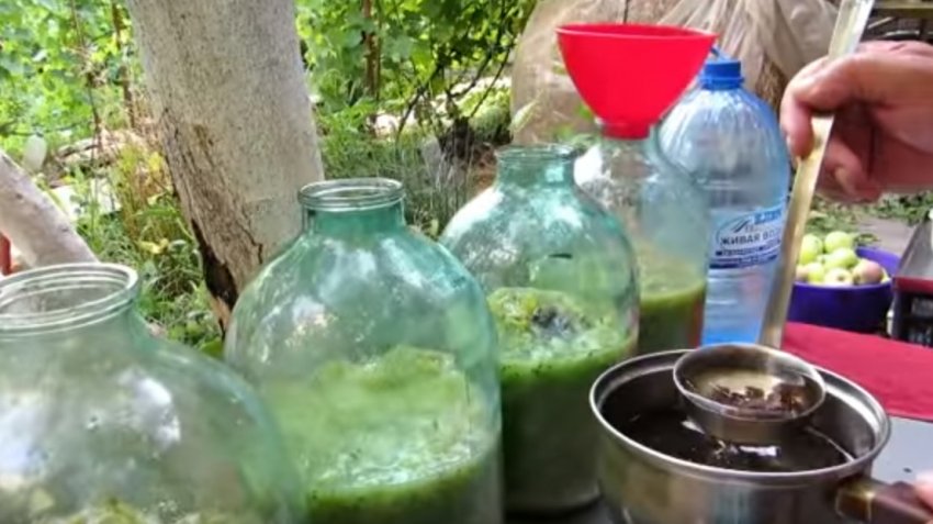 - Аґрус подрібнити будь-яким зручним способом, змішати з водою, встановити гідрозатвор і залишити в теплому місці для початкового бродіння на 4 місяці. Важливо, щоб ягоди були дуже солодкими і немитими, інакше зброджування не запуститься.