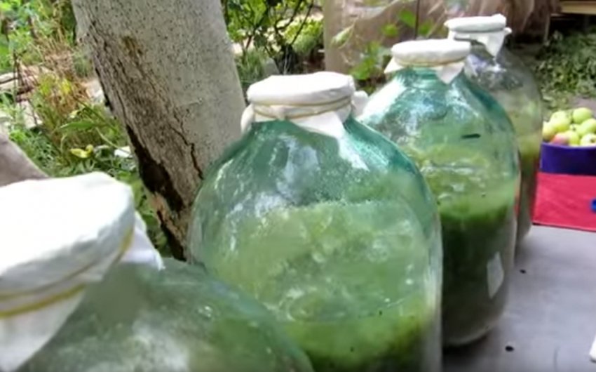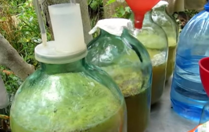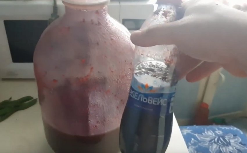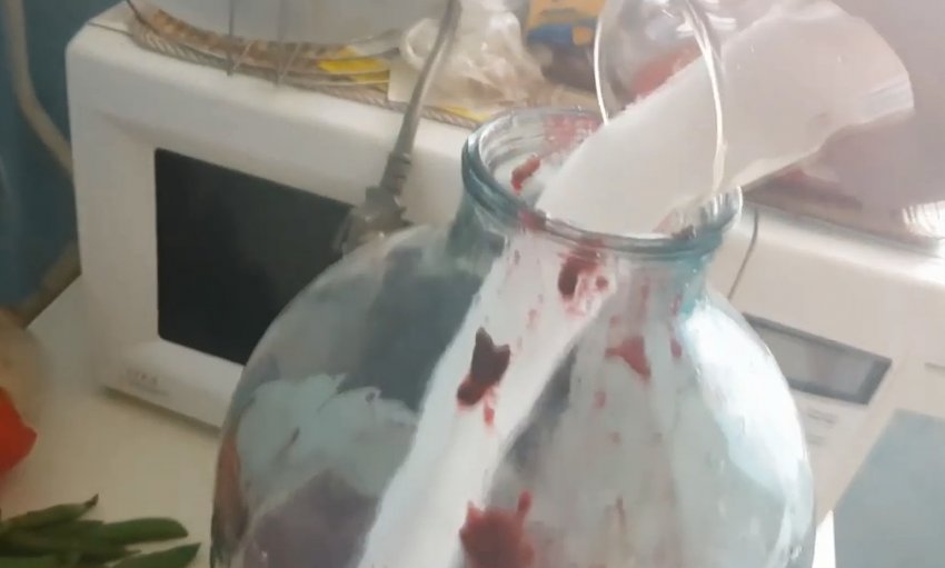 - Віджати сік, перелити його в чисту ємність для бродіння, додати розтерту до порошку таблетку діоксиду сірки, решту води і цукру, встановити гідрозатвор і залишити в теплому місці для активного бродіння.