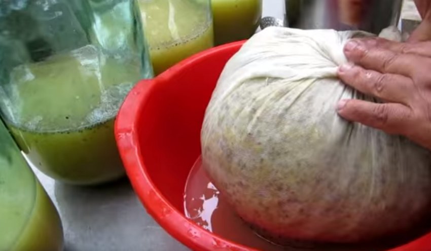 - Відокремити сік, що скупчився в нижній частині ємності, за допомогою трубочки, потім віджати рідину, що залишилася, з макухи. Саму макуху можна використовувати як сировину для приготування браги.