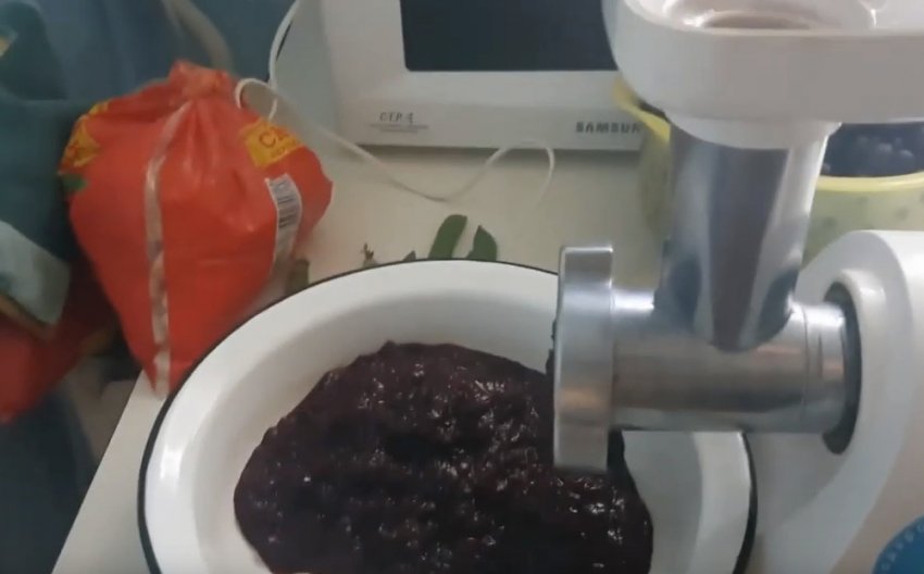 - Обидва види ягід пропустити через м'ясорубку. З гілочок смородину можна не знімати.