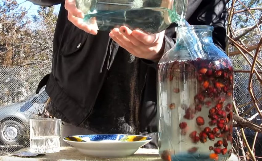 Спершу необхідно перемішати цукор (300 г) з теплою водою, потім наповнити тару сушеною шипшиною і ще раз перемішати.![]()