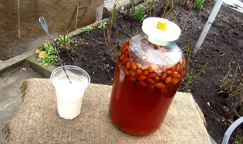 - Перед тим як почати приготування, плоди шипшини потрібно розчавити качалкою (від кісточок можна не очищати). У великий бутель додати шипшину, цукровий сироп (2 кг цукру на 2 л води), воду (8 літрів), родзинки або товчений виноград, а також дріжджі. Усе перемішати і накрити марлею.