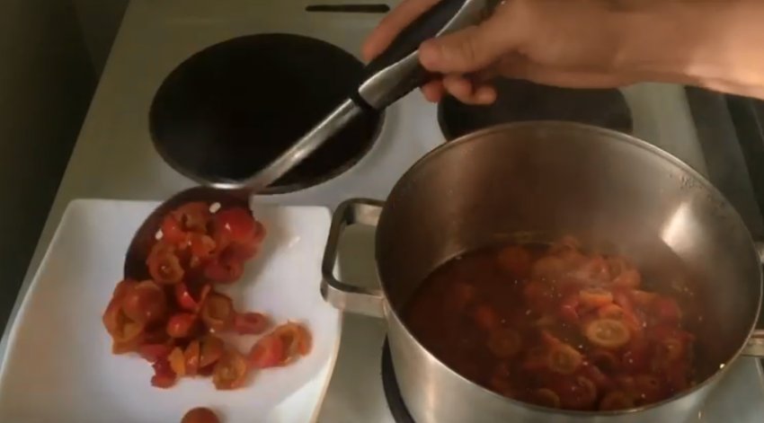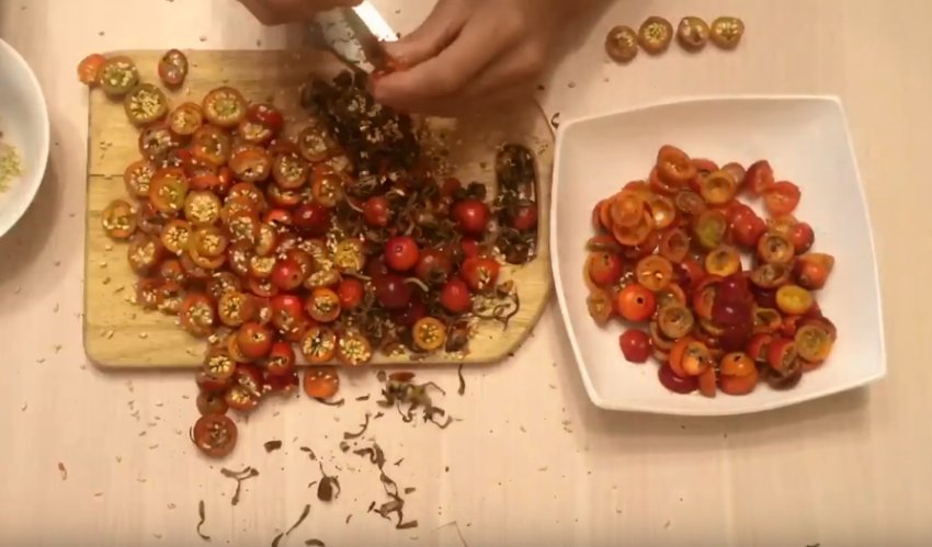 Збір краще здійснювати за допомогою ножиць, щоб відразу видаляти листя і плодоніжки. Удома врожай потрібно промити, розрізати навпіл і вичистити все насіння. Це зручно робити маленьким ножем із гострим кінчиком, кавовою ложкою або шпилькою для волосся.