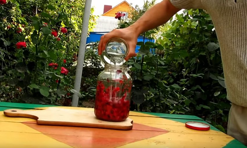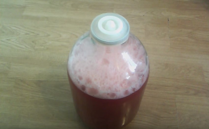 Всипати 0,5 кг цукру. Потім засипати ще двічі по 0,5 кг із проміжком у 3 дні. Закрити водяним затвором, помістити в тепле місце на 1,5 місяця. Перший тиждень кілька разів на день збовтувати напій.![]()