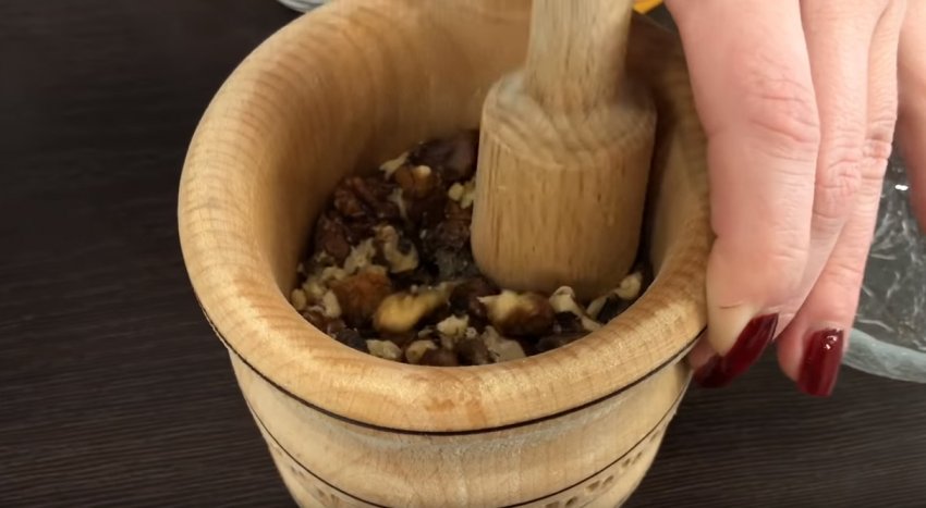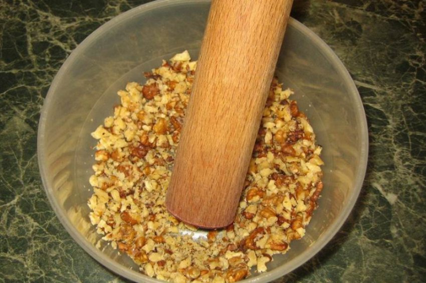 Розтовкти ядра волоських горіхів на не дуже дрібні фракції.![]()