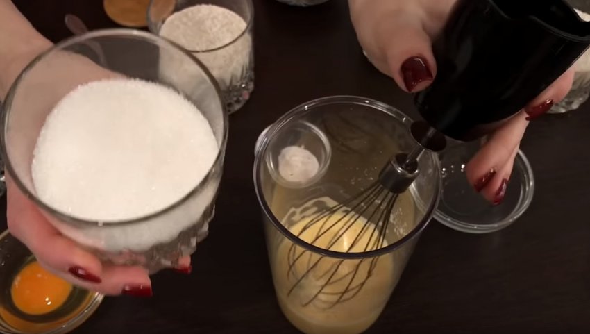 Збити за допомогою блендера яйце, додати у збите до пінистого стану яйце сіль за смаком, насипати туди ж половинну цукру, отриману суміш перекласти в більш місткий посуд.![]()