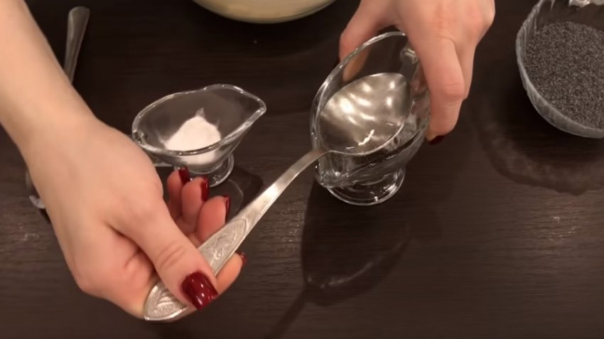 В окремій ємності погасити харчову соду за допомогою столового оцту і вилити розчин в отриману раніше суміш, ретельно її перемішавши.![]()