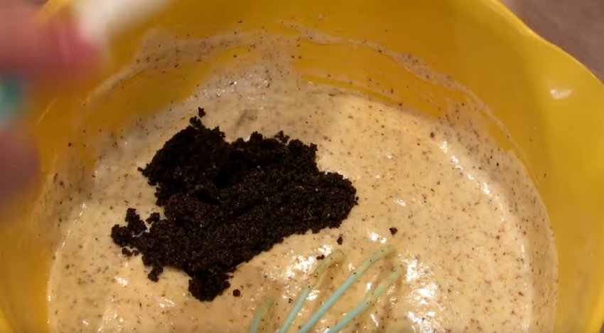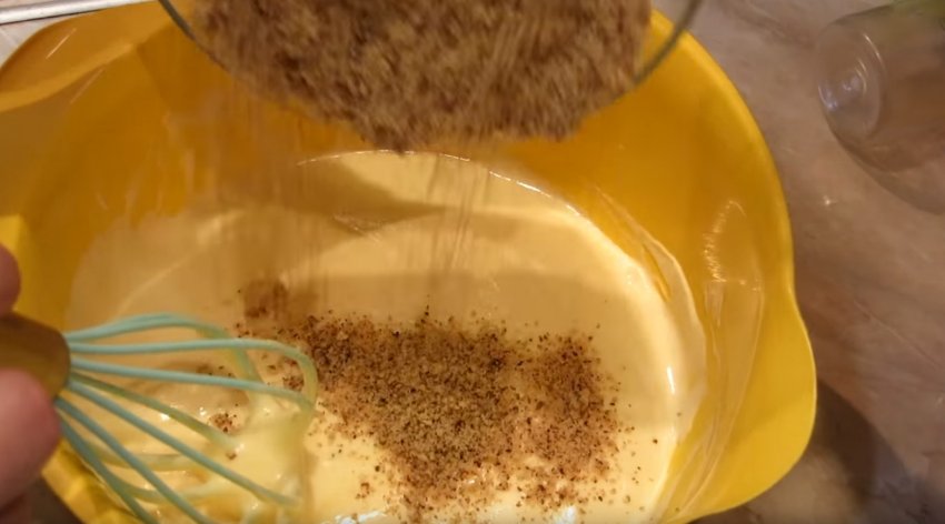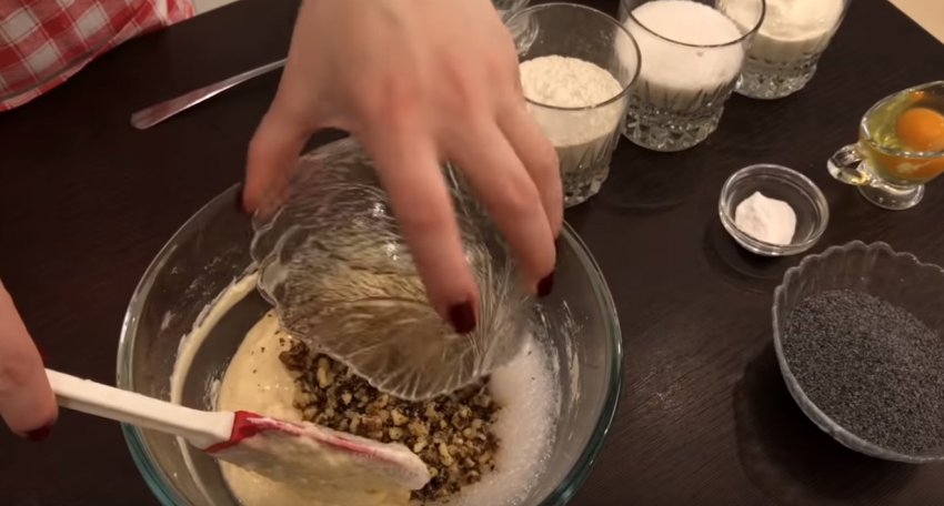 Після цього в неї додаються подрібнені ядра волоських горіхів, які теж впроваджуються в суміш за допомогою вінчика.![]()