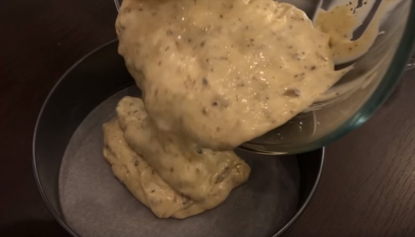 Отримане тісто виливають у форму діаметром 26 см, дно якої вистелене пергаментним папером.![]()