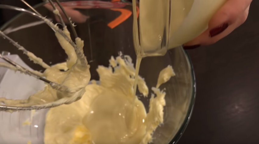 Коржі випікаються в духовці за температури +180°С 20-25 хв. Поки печуться коржі, потрібно приготувати крем, для чого в міксері збивають м'яке вершкове масло і згущене молоко.![]()