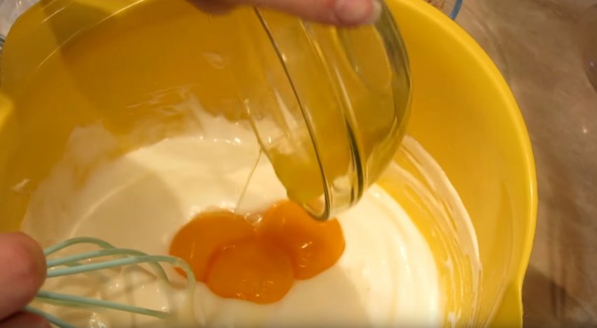 У процесі збивання білків у них потроху додається цукор. В отриману піноподібну масу додається рослинна олія, після чого віночком суміш перемішується, потім туди додаються жовтки, які за допомогою віночка впроваджуються в суміш.![]()