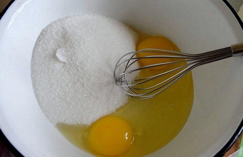 Змішайте яйця з цукром. За допомогою вінчика збийте.![]()
