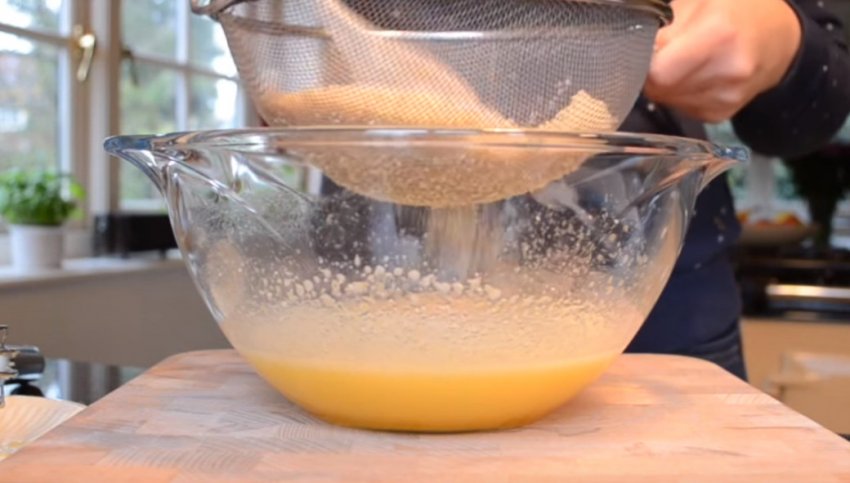 Вершкове масло розтопіть на повільному вогні та додайте до цукрово-яєчної суміші. Додайте просіяне через сито мигдалеве борошно і змішайте. всипте в суміш пекарський порошок. щоб посилити смак, додайте невелику щіпку солі.![]()