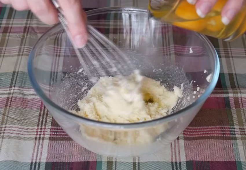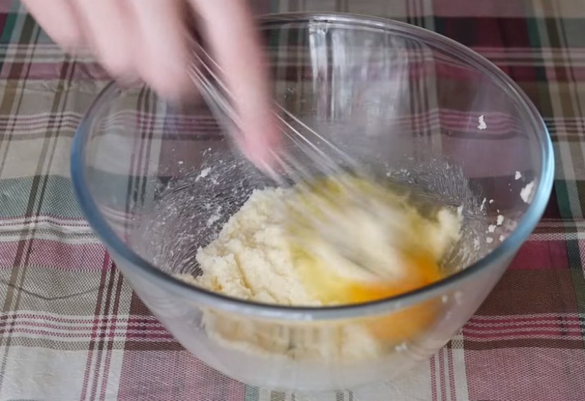 Перебити цукор з маслом. Вмішати в масу яйця, сіль, розтоплений шоколад.![]()