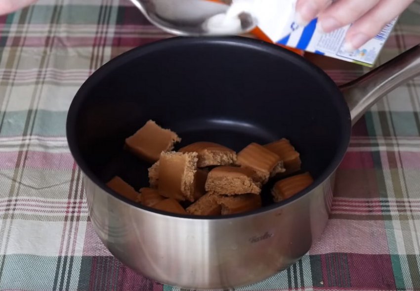 Приступити до приготування карамелі: у каструлю з товстим дном влити вершки і помістити ірис, поставити їх на водяну баню або на повільний вогонь.![]()