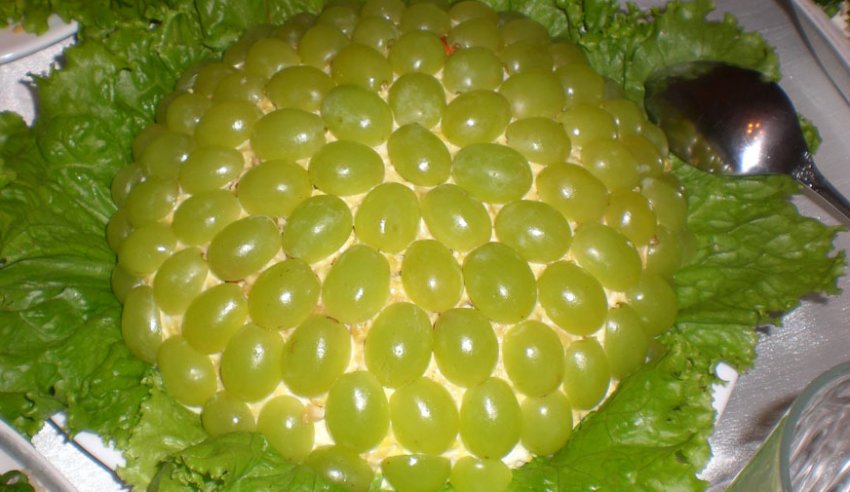 - Останній штрих - прикраса виноградом. Його укладають по всій поверхні салату, трохи вдавлюючи в м'який шар.