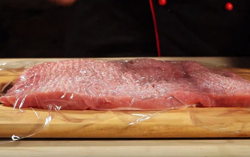 Загорніть розрізану корейку в харчову плівку, а потім з двох боків злегка відбийте кухонним молотком.![]()