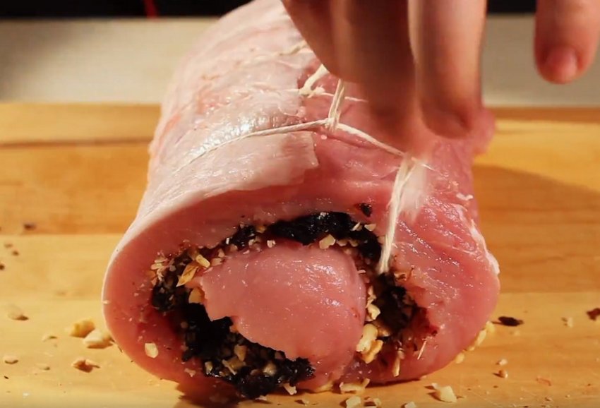 Сформуйте з м'яса рулет так, щоб начинка з чорносливу та горіхів опинилася всередині. Зафіксуйте все кулінарною ниткою.![]()