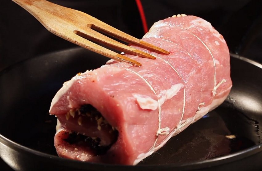 Розігрійте олію на сковорідці, а потім обсмажте рулетик з двох боків до золотистої скоринки. Цей крок є обов'язковим, попереднє обсмажування допомагає зберегти у свинині сік.![]()