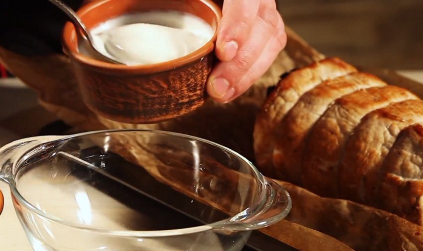 Покладіть м'ясо на деко, а потім запечіть його в духовці протягом 30 хвилин за 180°С. З'єднайте в окремій посудині сметану і томатну пасту, додайте до них сіль, перець і часник за смаком, після чого все ретельно перемішайте ложкою.![]()