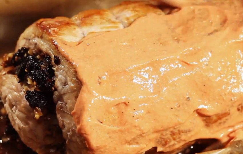 Дістаньте м'ясо з духовки, злегка остудіть, а потім звільніть від пергаментного паперу та кулінарної нитки, намажте рулет сметанно-томатною заправкою, а далі поверніть у духовку ще на 10 хвилин. Вживати таку страву можна з будь-яким овочевим гарніром.![]()
