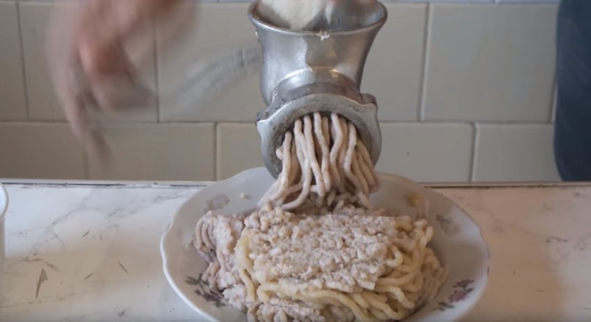 Картоплю відварити до стану готовності.Картоплю, волоські горіхи, сало, хліб і цибулю подрібнити за допомогою м'ясорубки або блендера.![]()