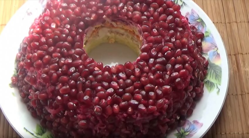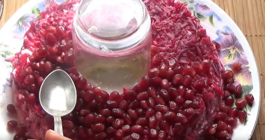 Викладіть зверху зерна граната, злегка вдавлюючи, видаліть із центру склянку і поставте салат у холодильник на 2-3 години, щоб він просочився![]()