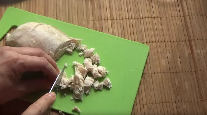 Відваріть куряче філе в підсоленій воді до готовності, остудіть і поріжте кубиками.![]()