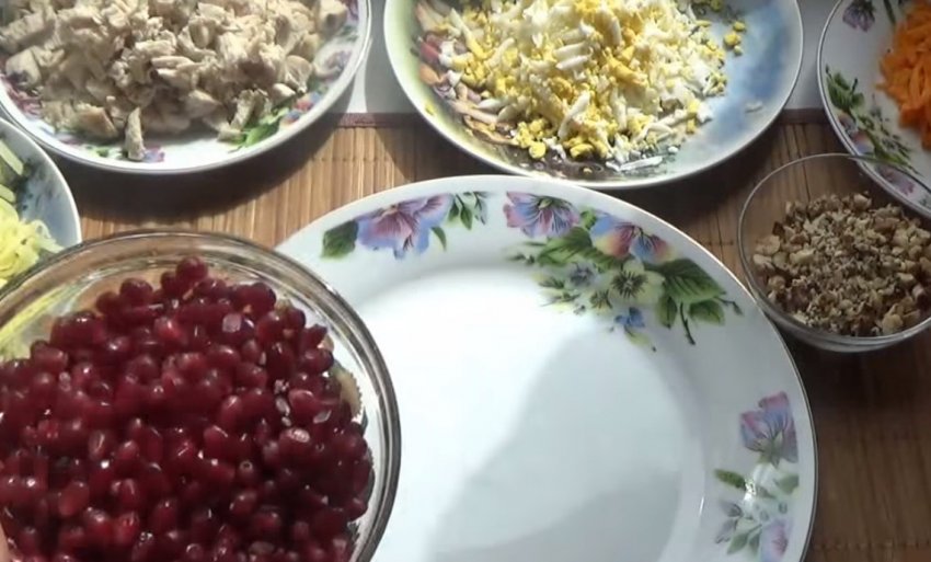 У цього салату багато назв - "Гранатовий браслет", "Червона шапочка" - так салат називають у побуті багато господинь. Він збирається шарами, тому всі інгредієнти в процесі підготовки розкладають по окремих мисках.