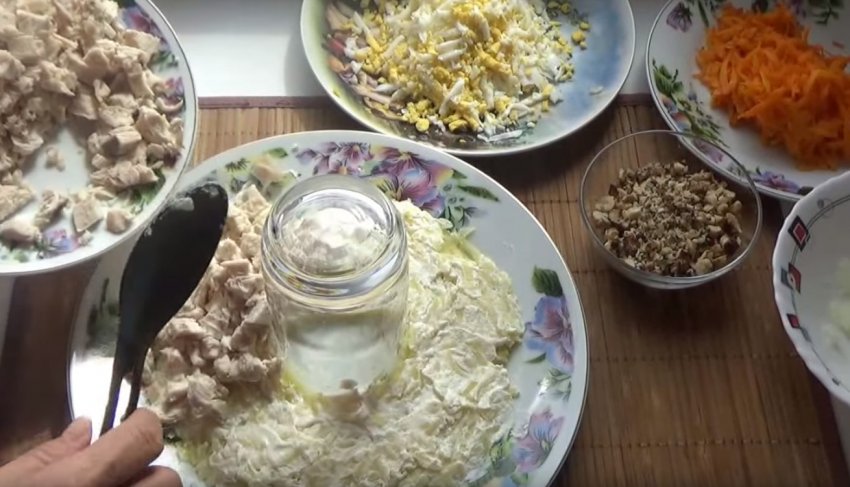 Збірка салату робиться послідовно шарами. Кожен шар перемазується майонезом. У центр страви встановіть порожню склянку, щоб надати закусці форму «браслета». Нижній шар - картопля, потім послідовно - половина курки, цибуля, морква, волоські горіхи, яйця, що залишилася, буряк.![]()