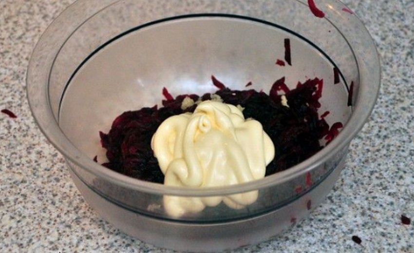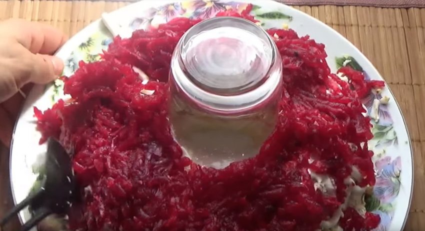 Останній буряковий шар розподіліть по всій поверхні і з боків, але майонезом не змащуйте.![]()