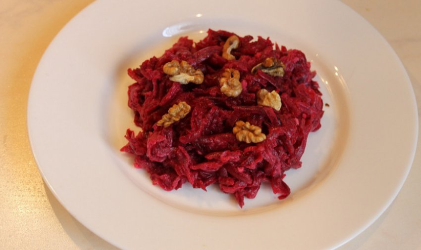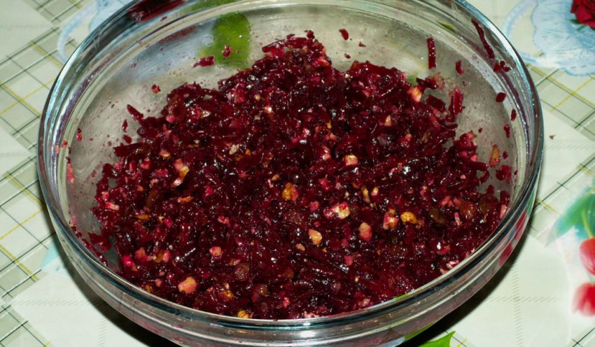 Розберіть гранат, зерна додайте до буряка, додайте мелені волоські горіхи (їх можна змолоти або подрібнити качалкою на дошці).![]()