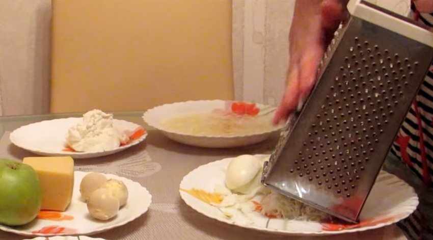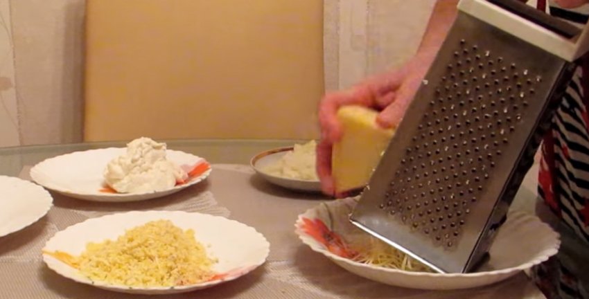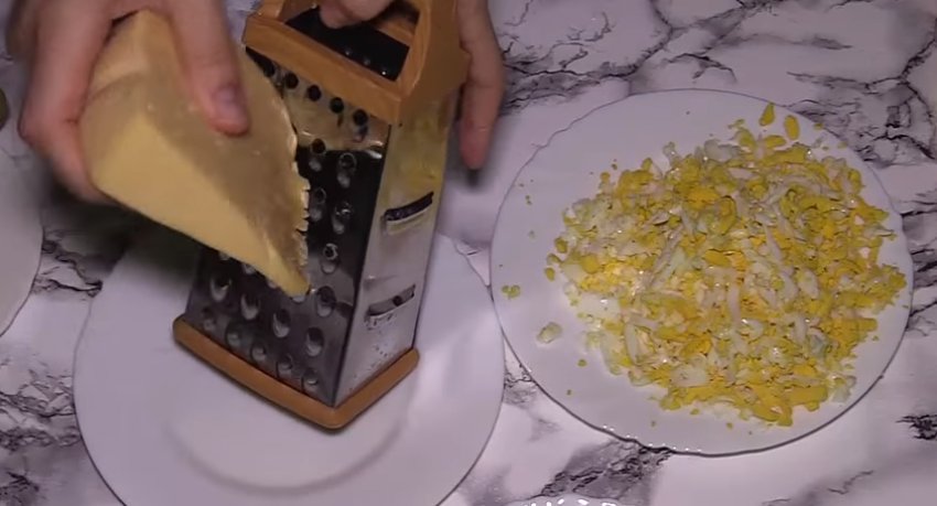 Очистіть і натріть на тертці спочатку яйця (на дрібному боці), а потім і твердий сир (на великій).![]()