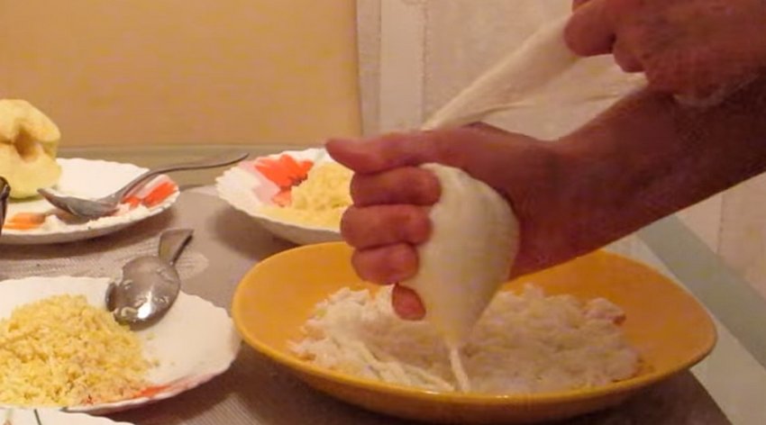 Знову змастіть поверхню майонезом, але цього разу можна не так рясно, акуратно приминаючи все ложкою.![]()