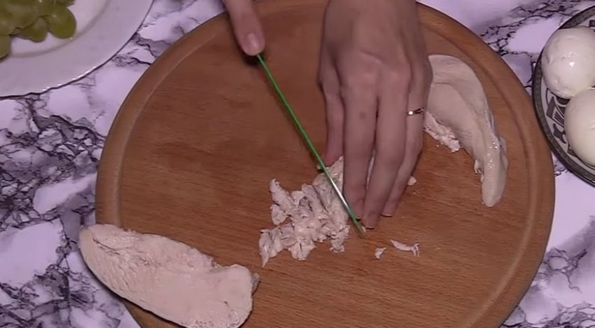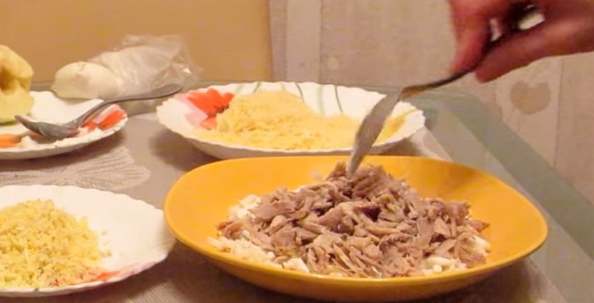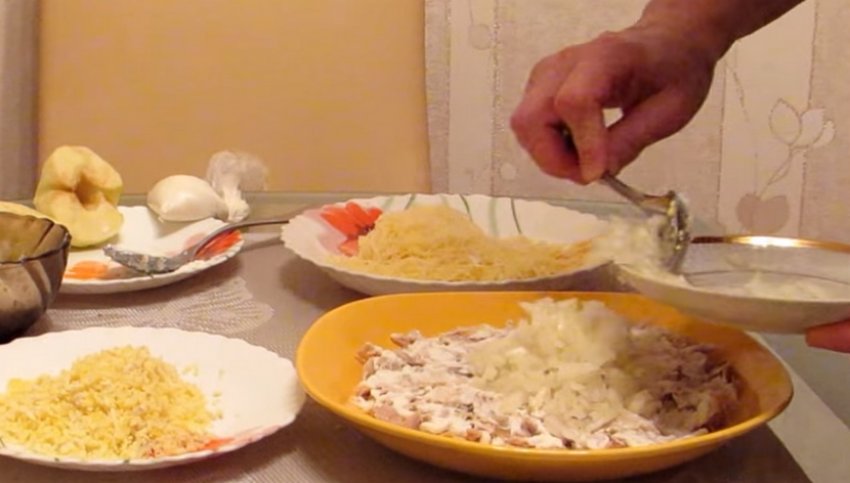 Добре просочивши майонезом перший шар, викладіть курячу грудку, так само рівномірно розподіляючи по поверхні (якщо курка варилася в підсоленій воді, то додатково її солити вже не потрібно).![]()