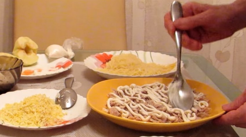 Перед подачею на стіл краще витримати страву в холодильнику щонайменше годину, щоб майонез добре просочив інші складові.![]()