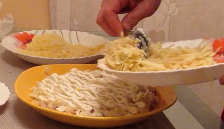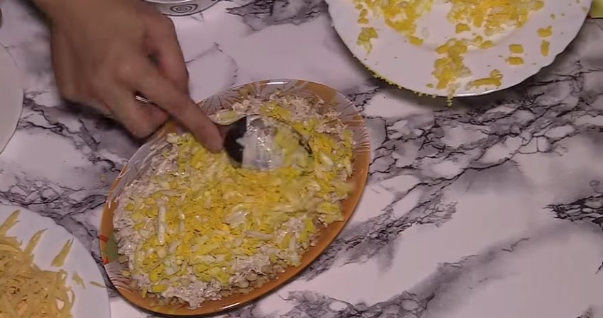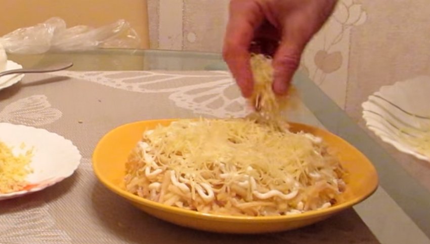 Викладіть тертий сир, причому так, щоб він не залишав просвітів від попередніх інгредієнтів, і знову промажте салат майонезом.![]()