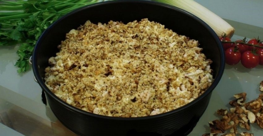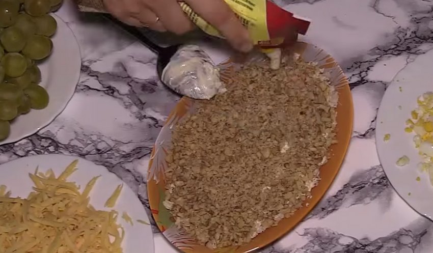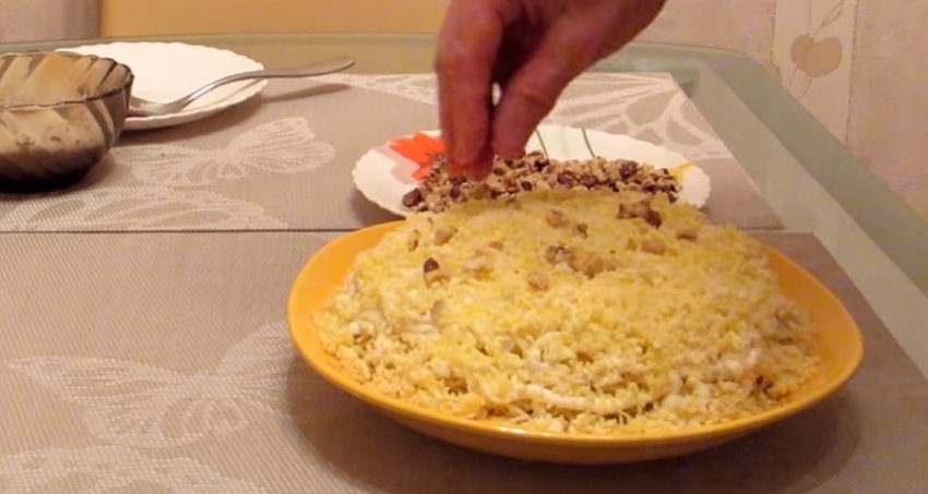 Останніми у страву викладаються волоські горіхи, попередньо промиті, підсушені та подрібнені в блендері на дрібні шматочки (як гранітна крихта). Промащувати салат майонезною сумішшю більше не потрібно, а для прикраси можна викласти на поверхні візерунок із половинок горіха.![]()