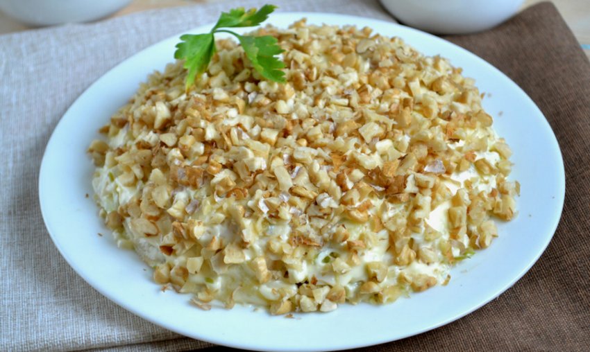 Вибір способів приготування салату з волоськими горіхами дійсно великий, тому кожна господиня може підібрати той, що найбільше відповідає її потребам, з погляду продуктів, що використовуються, і характеру майбутнього застілля. Для днів народження, Нового Року та інших схожих свят непоганими будуть описані нижче варіанти.