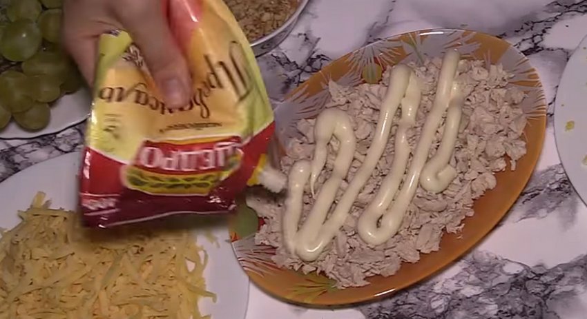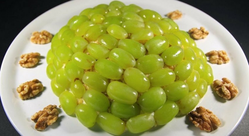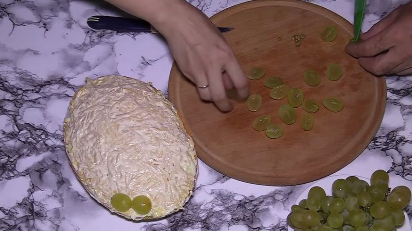 Наступним шаром розподіліть по поверхні сир з рясним майонезним шаром і прикрасьте салат виноградом, попередньо розділивши кожну виноградину на дві половинки.![]()
