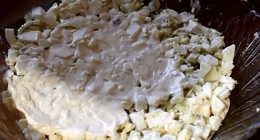 Промажте курку майонезом і викладіть поверх нарізані такими ж кубиками варені яйця, злегка приминаючи рівномірний шар ложкою.![]()