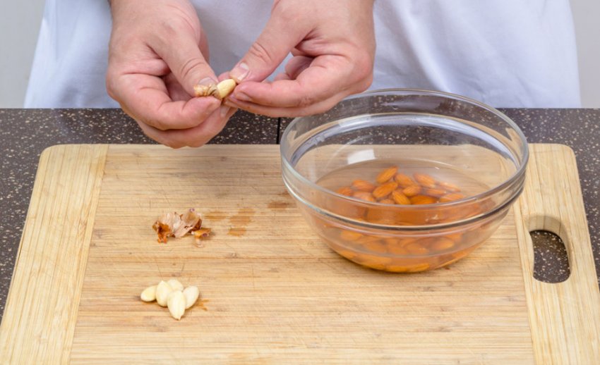 Залийте чистий мигдаль окропом на 10 хвилин, потім злийте воду і промийте горіхи під холодною проточною водою, одночасно видаляючи з них злізлу шкірочку. Залийте холодною водою відміряну кількість желатину і залиште його на 10 хвилин для розбухання.![]()