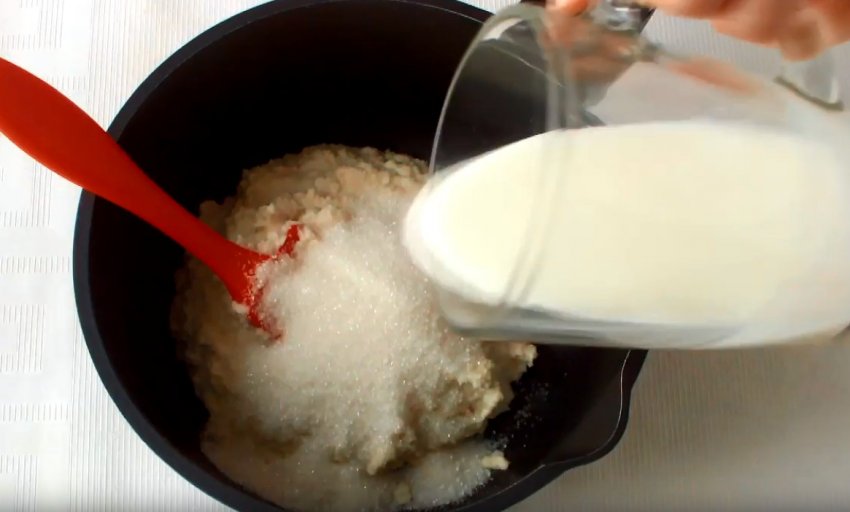 Перекладіть мигдалеву масу, 40 г цукру і порцію молока, що залишилася, в дрібну каструлю і доведіть суміш до кипіння на середньому вогні, щойно вона закипить, трохи зменшіть вогонь і проваріть все протягом 2 хвилин.![]()