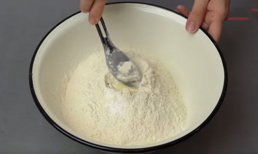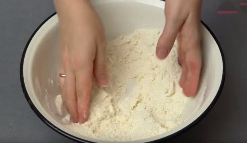 Викладіть у миску для тіста вершкове масло, відправте туди ж просіяне пшеничне борошно, сіль, ванілін і соду. Розмішайте тісто спочатку ложкою, а потім руками до стану крихти.![]()
