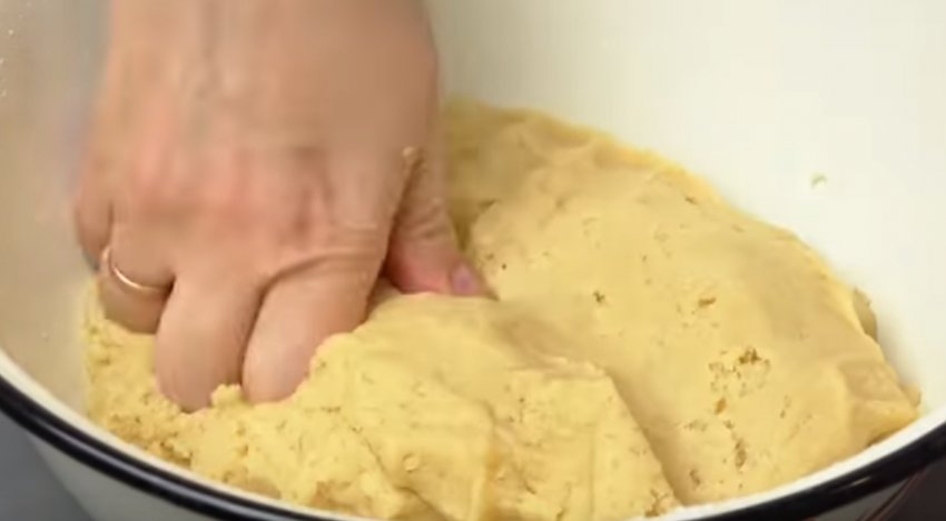 До вершково-яєчної солодкої маси потрібно всипати 2 склянки попередньо просіяного пшеничного борошна. Майбутнє тісто слід розім'яти вручну до однорідної маси. Воно має вийти м'яким і в міру пружним, не липнути до рук.![]()