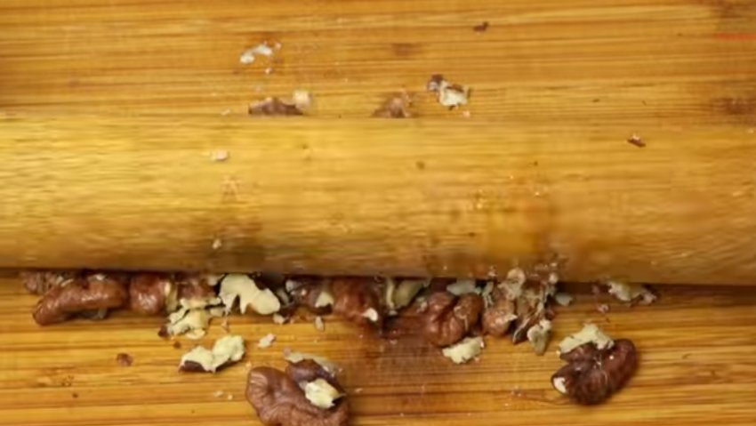 Волоські горіхи очистіть від шкаралупи, потім викладіть на робочу поверхню або дошку і злегка пройдіться по них качалкою, розминаючи на не надто великі шматочки.![]()