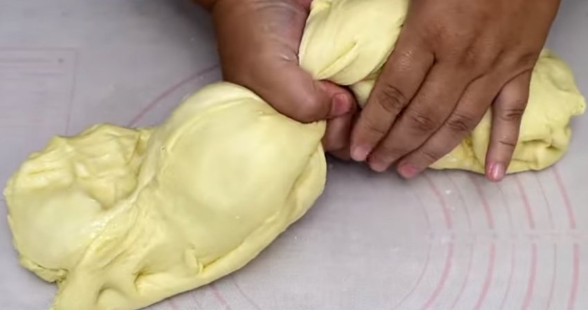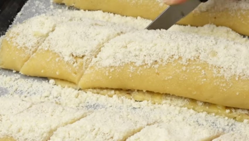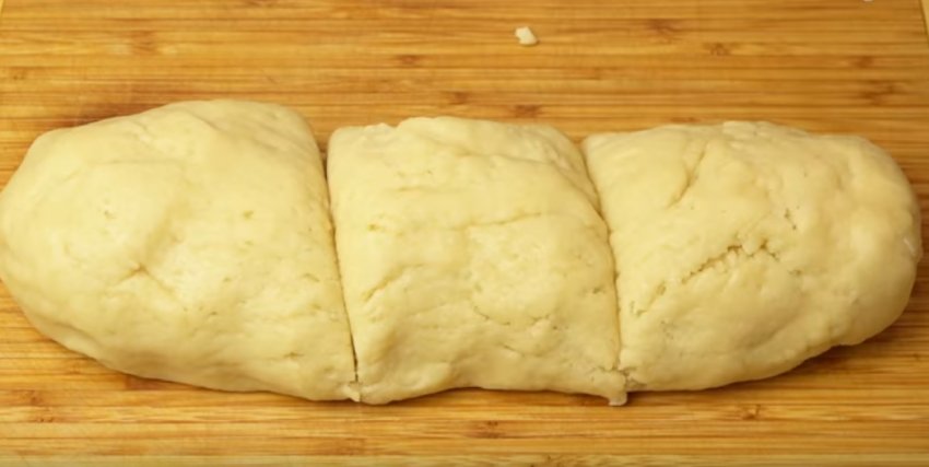 Тісто скачайте в рулет. Розріжте на три частини.![]()