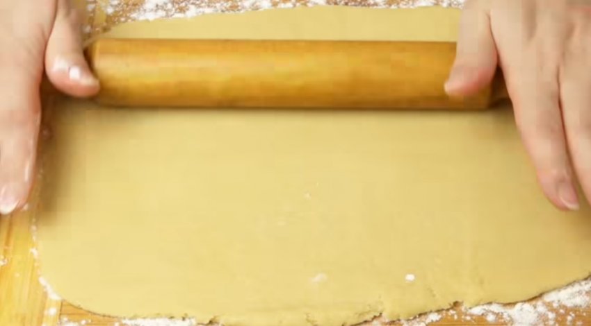 Робочу поверхню (або дошку) присипте невеликою кількістю борошна. Першу частину тіста викладіть і розкачайте качалкою так, щоб воно було тонким.![]()